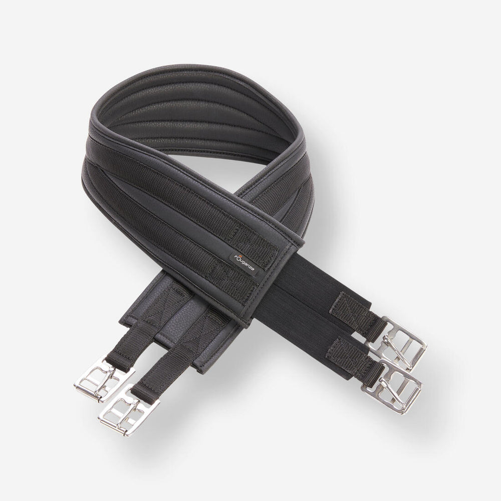Confeccionada para aportar máxima comodidad al caballo, la cincha de equitación 100 tiene una forma anatómica y está provista de elásticos asimétricos. El material se lava fácilmente con una esponja.