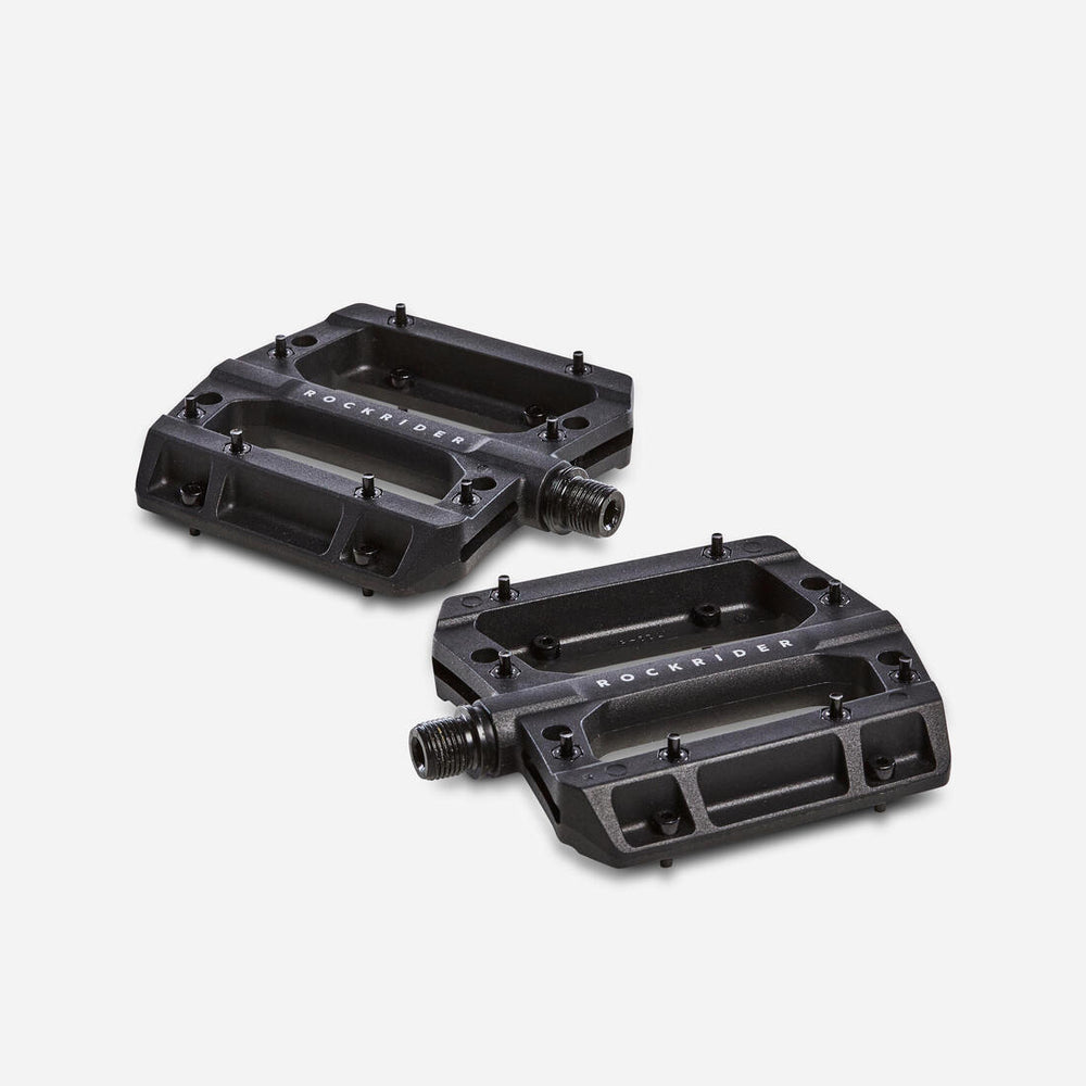 Fabricados con resina, los pedales planos MTB 700 limitan el riesgo de lesión de las tibias y las pantorrillas en caso de que el pedal vuelva atrás accidentalmente.
