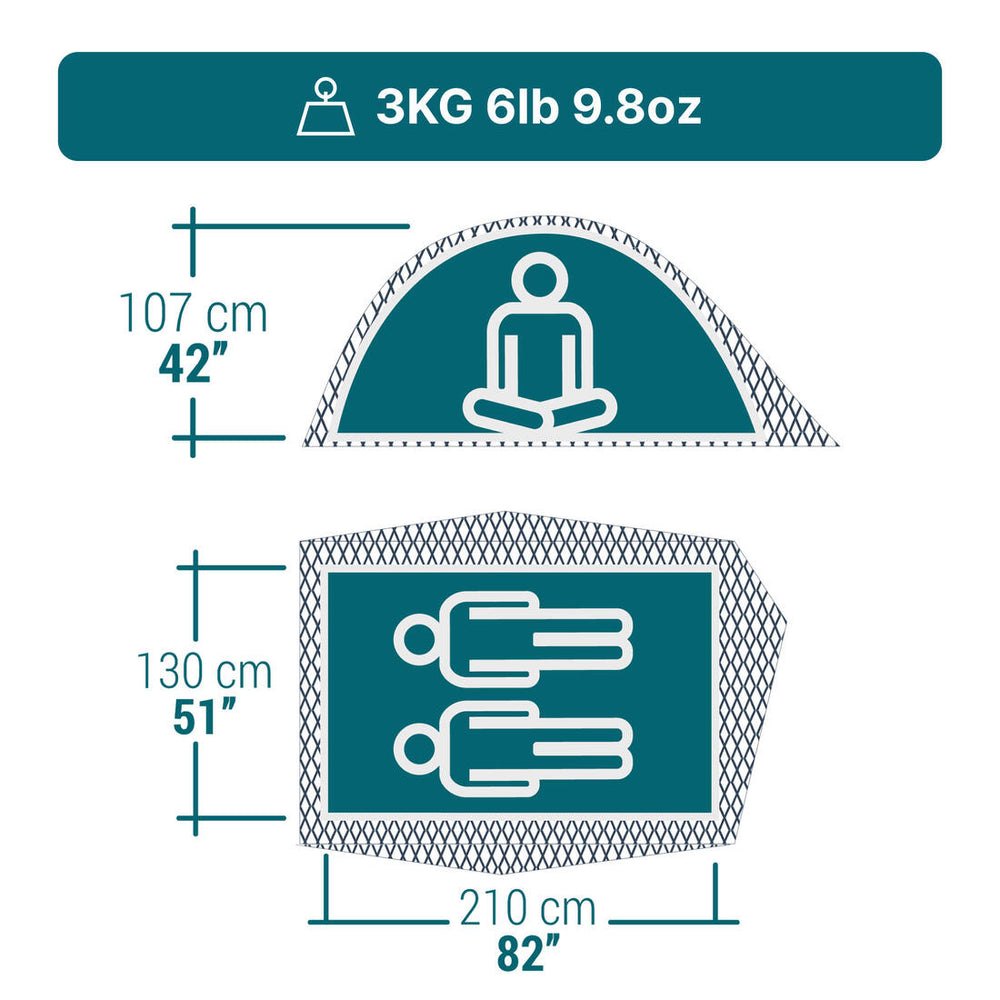 Diseñada para dos personas que quieren disfrutar de la naturaleza con mayor frescor y oscuridad. Guardada en su funda ocupa 58 x 15 x 14 centímetros y pesa 3 kg