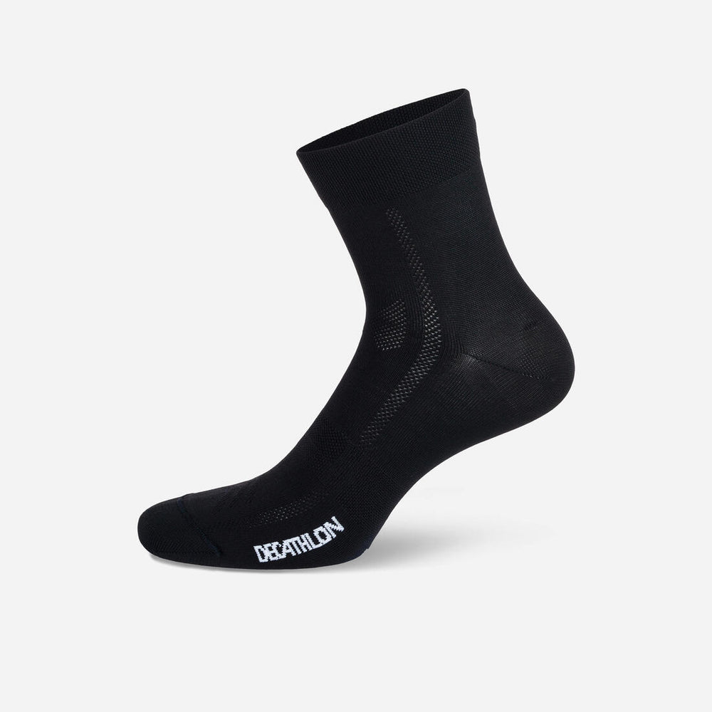 Este par de calcetines B'TWIN 500 evacúa el sudor y aporta comodidad durante las salidas regulares gracias al componente ligero.