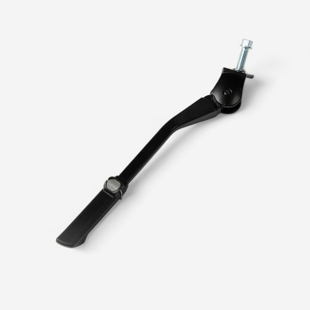 Fija el caballete para bici plegable de 20 pulgadas bajo el cuadro. El botón facilita el ajuste de la longitud del caballete para adaptarlo a diferentes terrenos y cargas, para una mayor estabilidad.