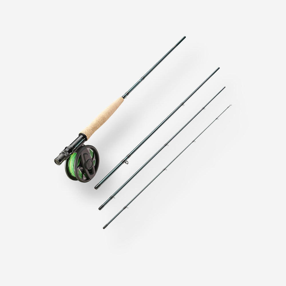 Conjunto de caña (8'6: 2,6 m), carrete, seda (DT5F) y bajo de línea para pescar con mosca seca y ninfas para trucha y pescado blanco en ríos y superficies de agua a corta y media distancia.