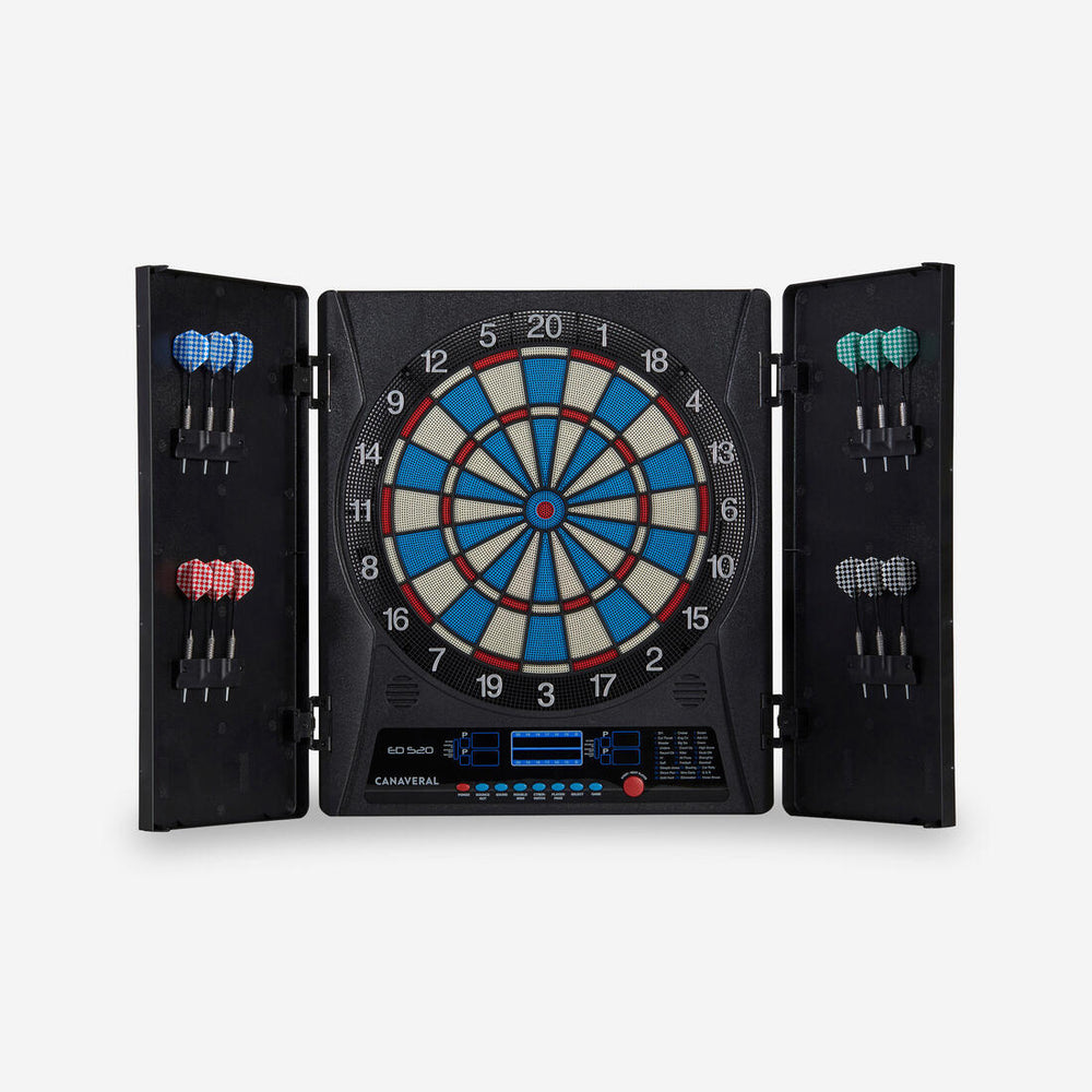 Concebido para el jugador de dardos que busca una diana electrónica interactiva y con puertas de guardado. Incluyen 12 dardos y funciona con luz.