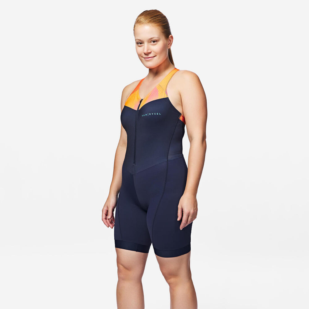Nuestro equipo de triatletas apasionados(as) ha creado este tritraje, equipamiento icónico e imprescindible, para tus primeros triatlones de corta distancia.